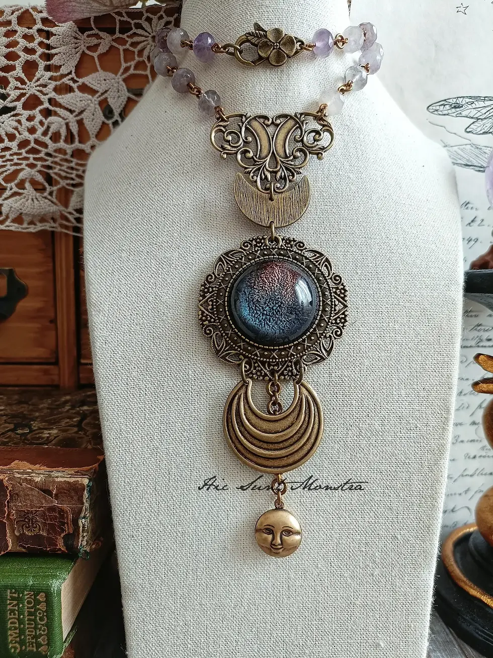 Grazie a riferimenti simbolici, esoterici, mitologici e letterari, i miei monili vogliono affascinare e coinvolgere, ma vogliono soprattutto raccontare una storia che parli della Meraviglia che ciascuna di noi coltiva dentro.